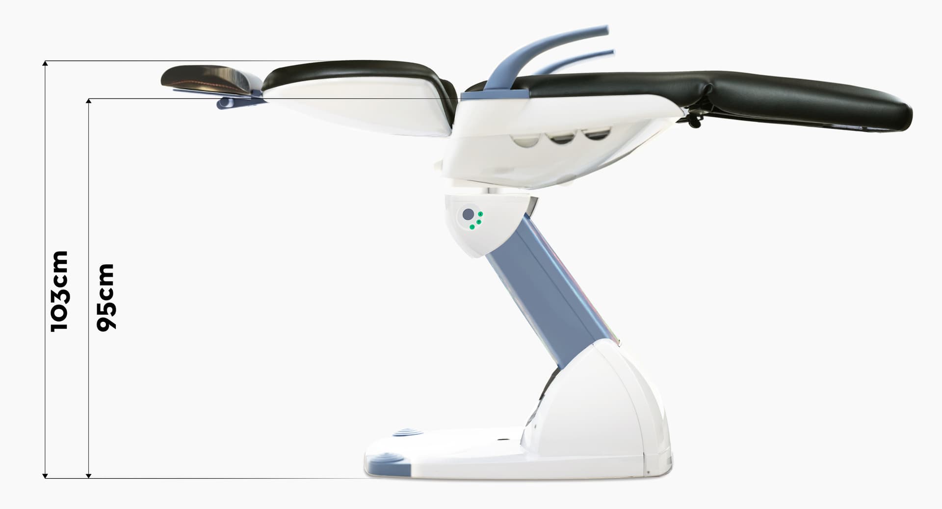 Neo Potilastuoli nousee vaikuttavaan 95 cm:iin ja laskeutuu 45 cm:iin, tarjoten optimaalista potilasmukavuutta ja saavutettavuutta. Pehmusteemme kanssa Neo Potilastuoli nostaa potilaan jopa 103 cm:iin, mahdollistaen huippuluokan ergonomiset työskentelyolosuhteet.