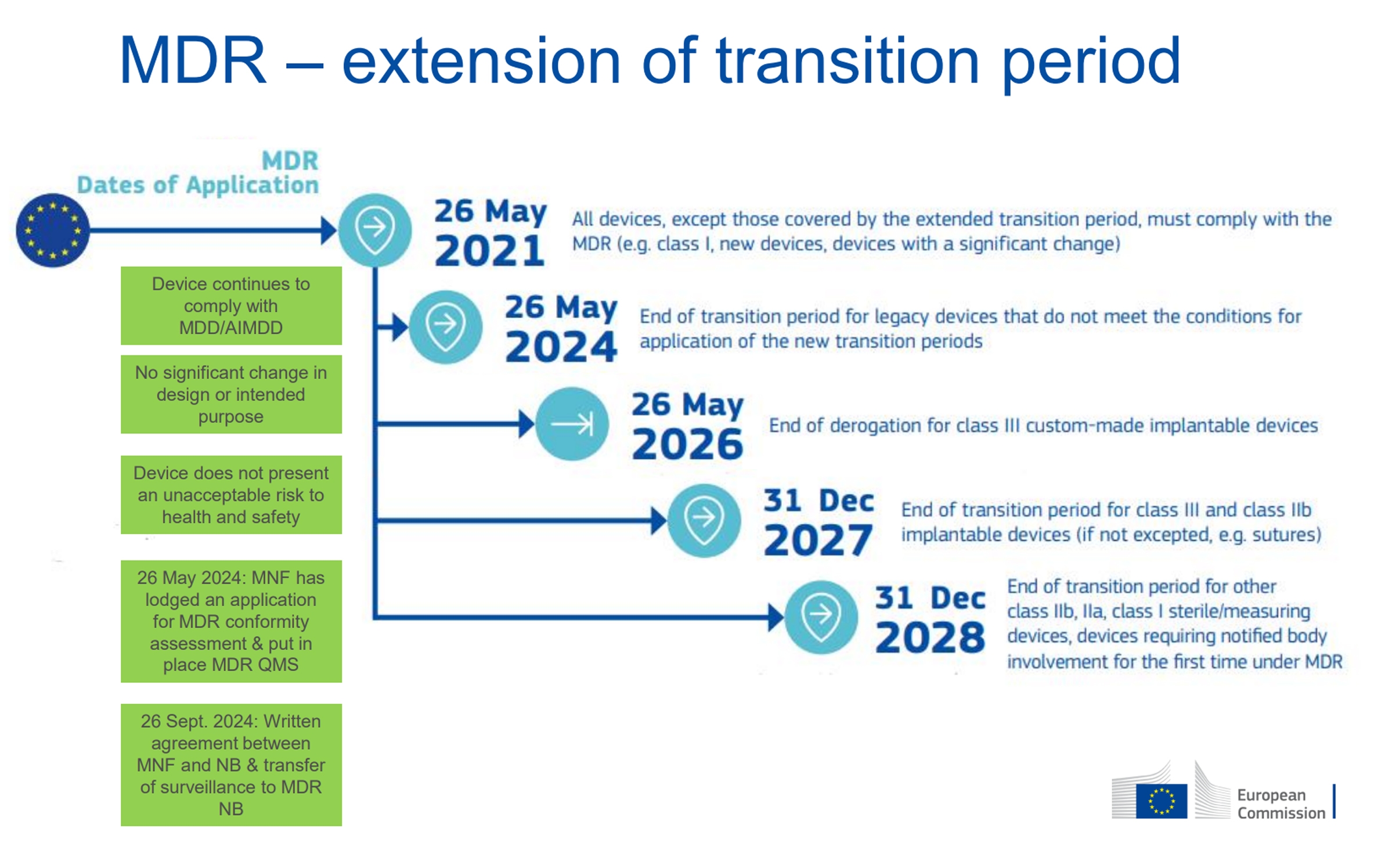 Let’s provide some background. The Medical Device Regulation (MDR) is a mandatory EU legislation approved in April 2017. Manufacturers were given three years of transition time to prepare and comply with the requirements, with the deadline set for May 26, 2020. This timeline was tight for transitioning half a million different medical devices from the Medical Device Directive (MDD 93/42/EEC) to MDR. The COVID-19 pandemic, which began in 2020, led to an extension of the transition period to May 26, 2021. Until that date, new medical devices could be marketed under the old MDD framework. However, significant modifications to products were no longer possible unless the product was first approved under MDR, after which the changes could be notified and/or approved by a Notified Body.