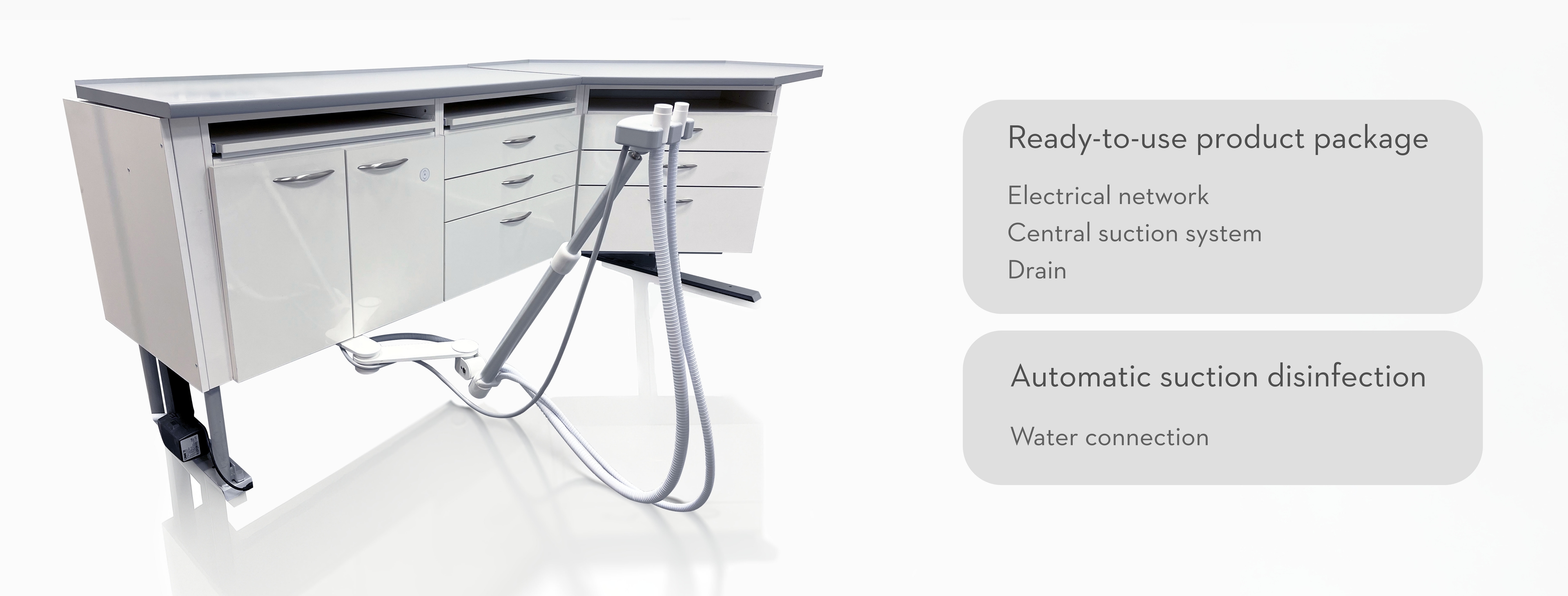 The Cabinet Suction is delivered as a ready-to-use package with all necessary connections included — power, drain, and central suction interface.